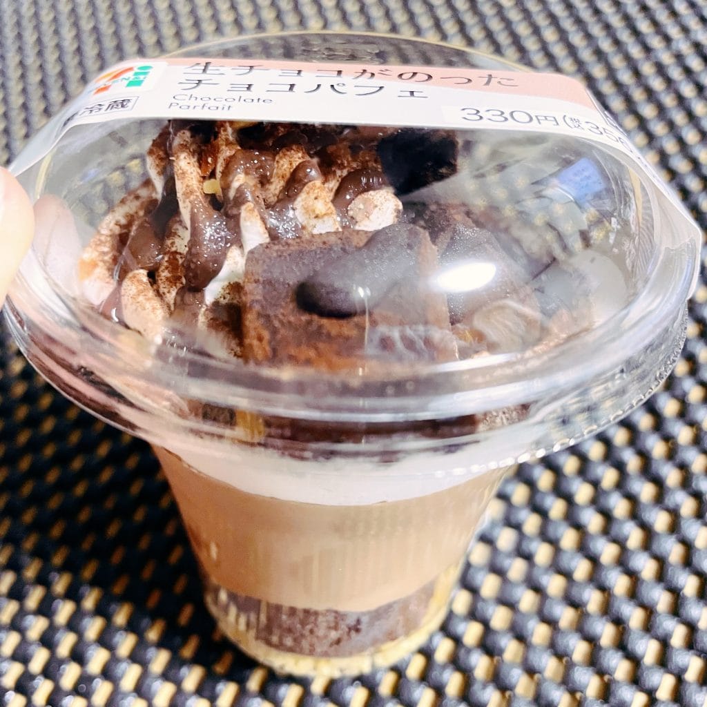 セブンイレブンの生チョコがのったチョコパフェはセブンイレブンのカップスイーツ.