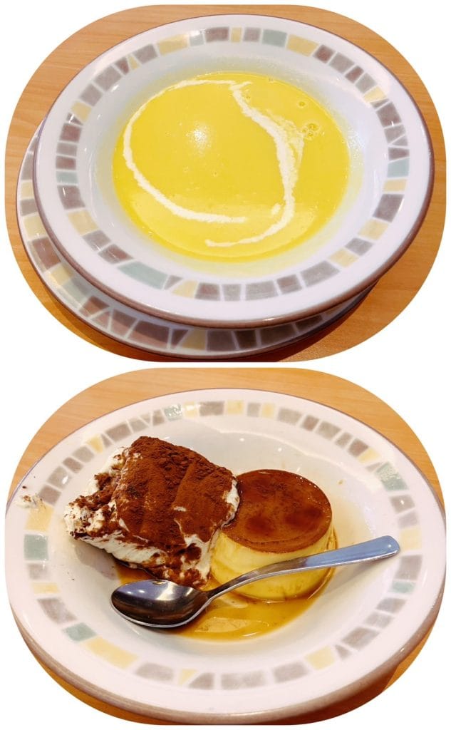 「コーンクリームスープ」と「プリンとティラミス クラシコの盛合せ」をいただきました.
