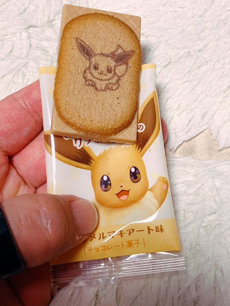 イーブイは,キャラメルマキアート味のチョコレートがサンドされて居ます.